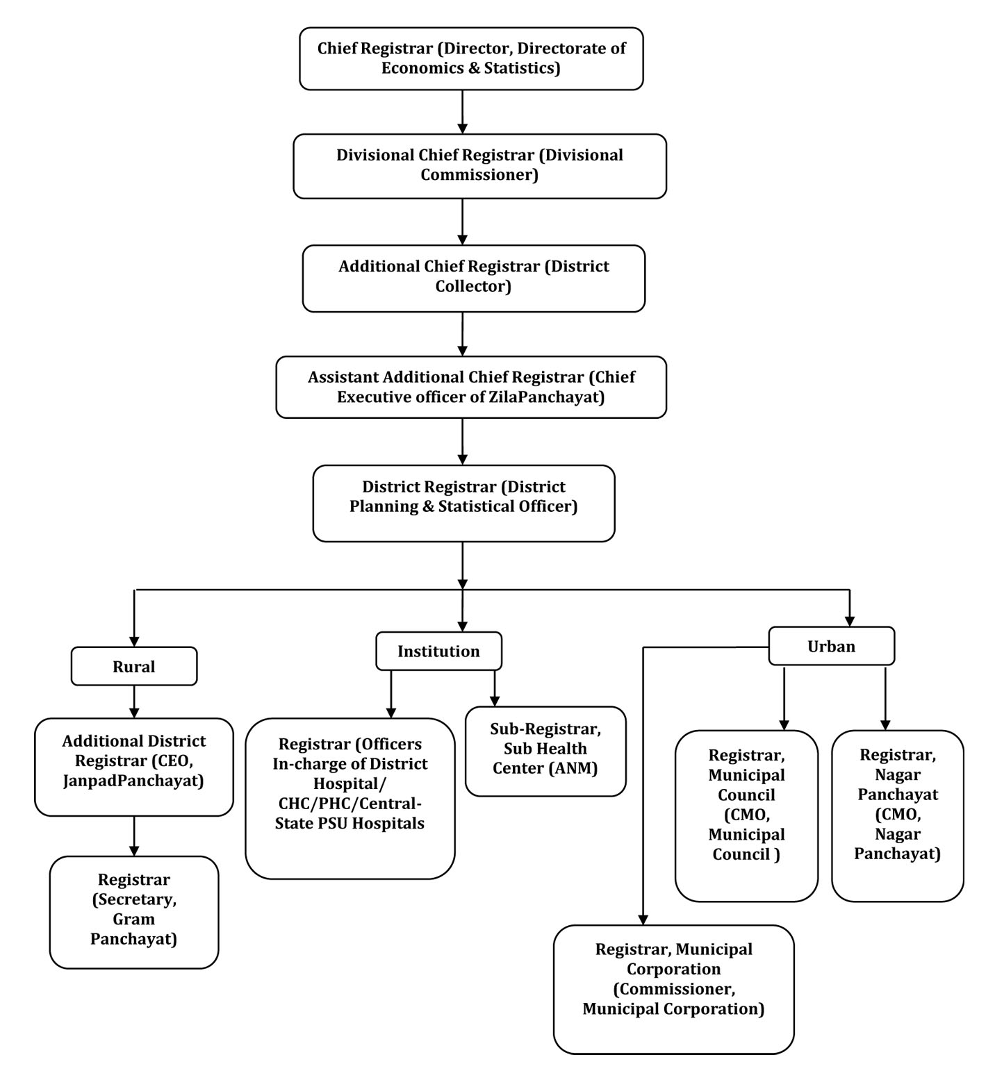 1. State level :- At the state level, the Director, Directorate of Economics and Statistics, Chhattisgarh Raipur has been assigned the responsibility of Chief Registrar (Birth-Death) and for his assistance, Joint Director (Vital Number), Deputy Director (Vital Number) and Assistant Director (Vital Number) Directorate of Economics and Statistics, Chhattisgarh have been assigned the responsibility of Joint Chief Registrar, Deputy Chief Registrar and Assistant Chief Registrar (Birth-Death) respectively. (State Notification dated 08/11/2007, and 05/07/2011)